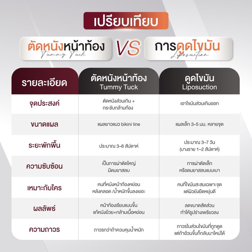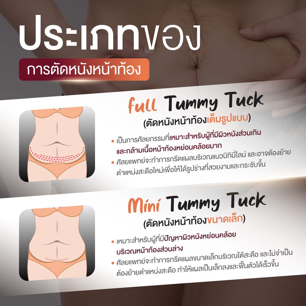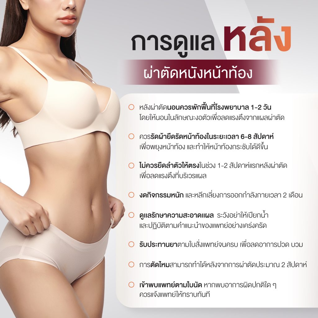 ศัลยกรรมตัดหนังหน้าท้องคืออะไร? Abdominoplasty เป็นการผ่าตัดเอาหนังหน้าท้องส่วนเกินออก พร้อมกับกระชับกล้ามเนื้อหน้าท้องที่แยกออกจากกัน (มักพบหลังการตั้งครรภ์หรือในผู้ที่น้ำหนักตัวเคยเพิ่มมากในอดีต) การผ่าตัดนี้จะช่วยให้หน้าท้องเรียบแบน ดูกระชับ และมีสัดส่วนที่ดีขึ้น